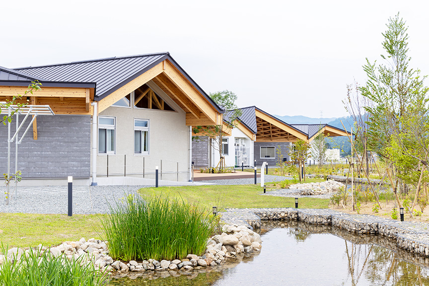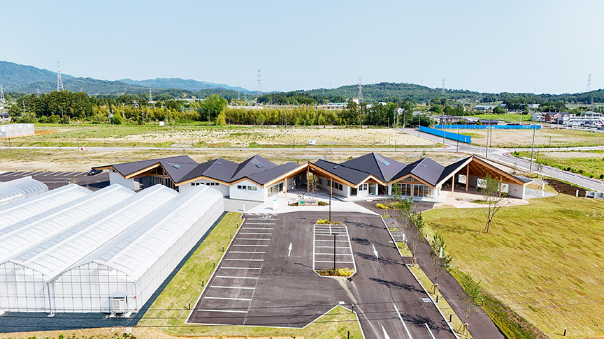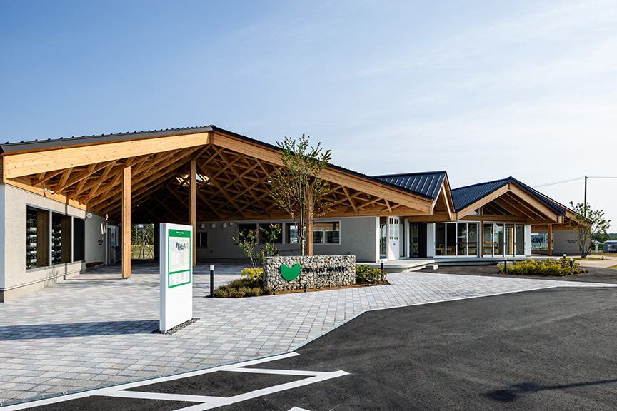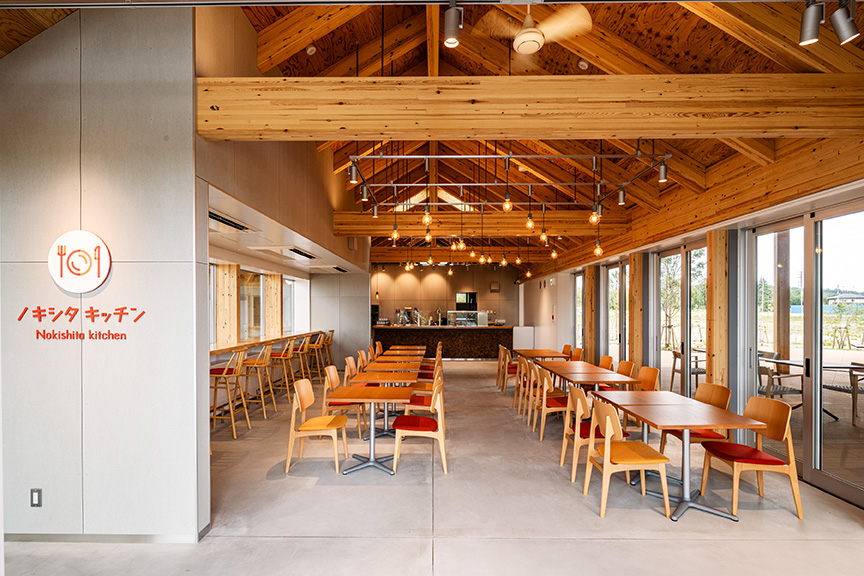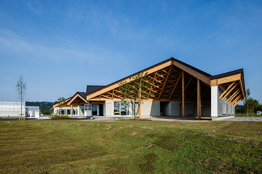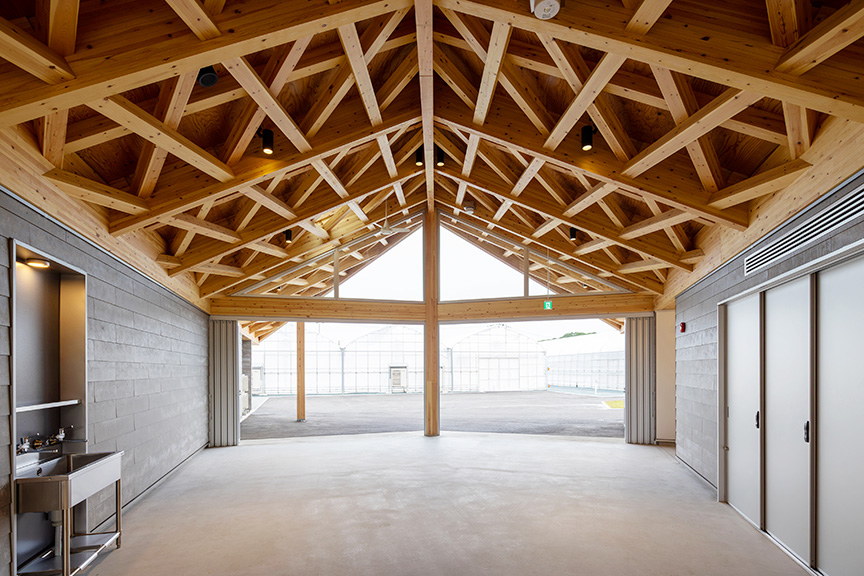 敷地内には、建築物以外にも生産機能を備えたビニールハウス、キウイ園、ビオトープ、広場などを計画し、敷地内の内外部空間を町の人々に楽しんでもらうことを意図した。建築については、植物工場や加工場、レストランなど、それぞれの空間に求められる諸条件が違ったため、ある種の独立性を持たせた。その上で、全体がつながっている空気を作るため、ひと繋がりの屋根を設け、各所の間にさまざまな軒下空間を設けることとした。軒下は、内部空間同士を適度な距離でつなぐだけでなく、隣接するビオトープやキウイ園、広場などの外部空間と連携することで、さまざまな使われ方ができるように考慮した。